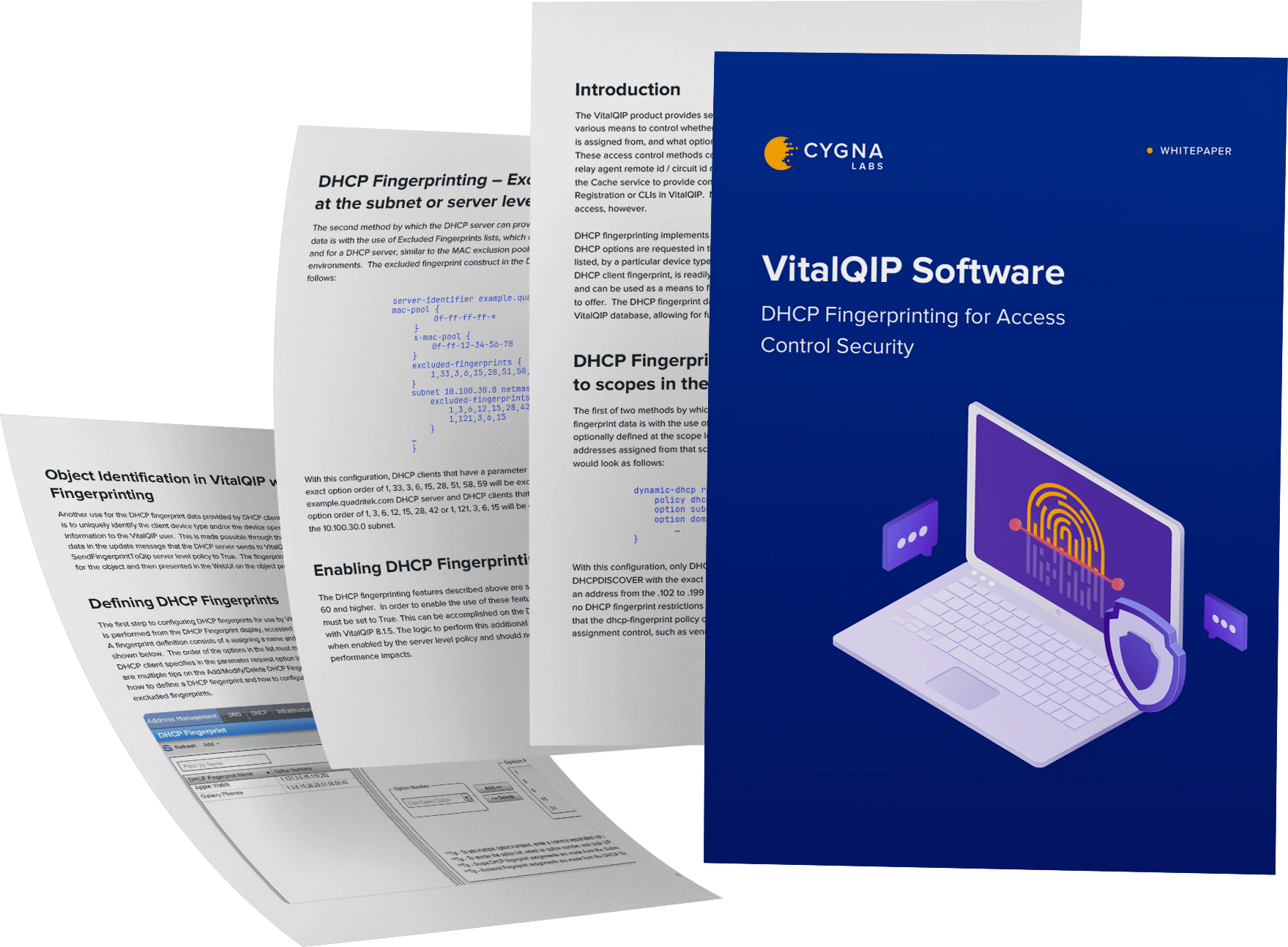 DHCP fingerprinting implements a method of access control utilizing the unique signature of which DHCP options are requested in the Parameter Request List (option 55) and the order in which they are listed, by a particular device type or operating system. This information, commonly referred to as the DHCP client fingerprint, is readily available to the DHCP server in the client’s DHCPDISCOVER message and can be used as a means to further decide whether to offer a lease and what address and options to offer. The DHCP fingerprint data can also be sent to the VitalQIP Update service for inclusion in the VitalQIP database, allowing for further analysis such as searches and reports.